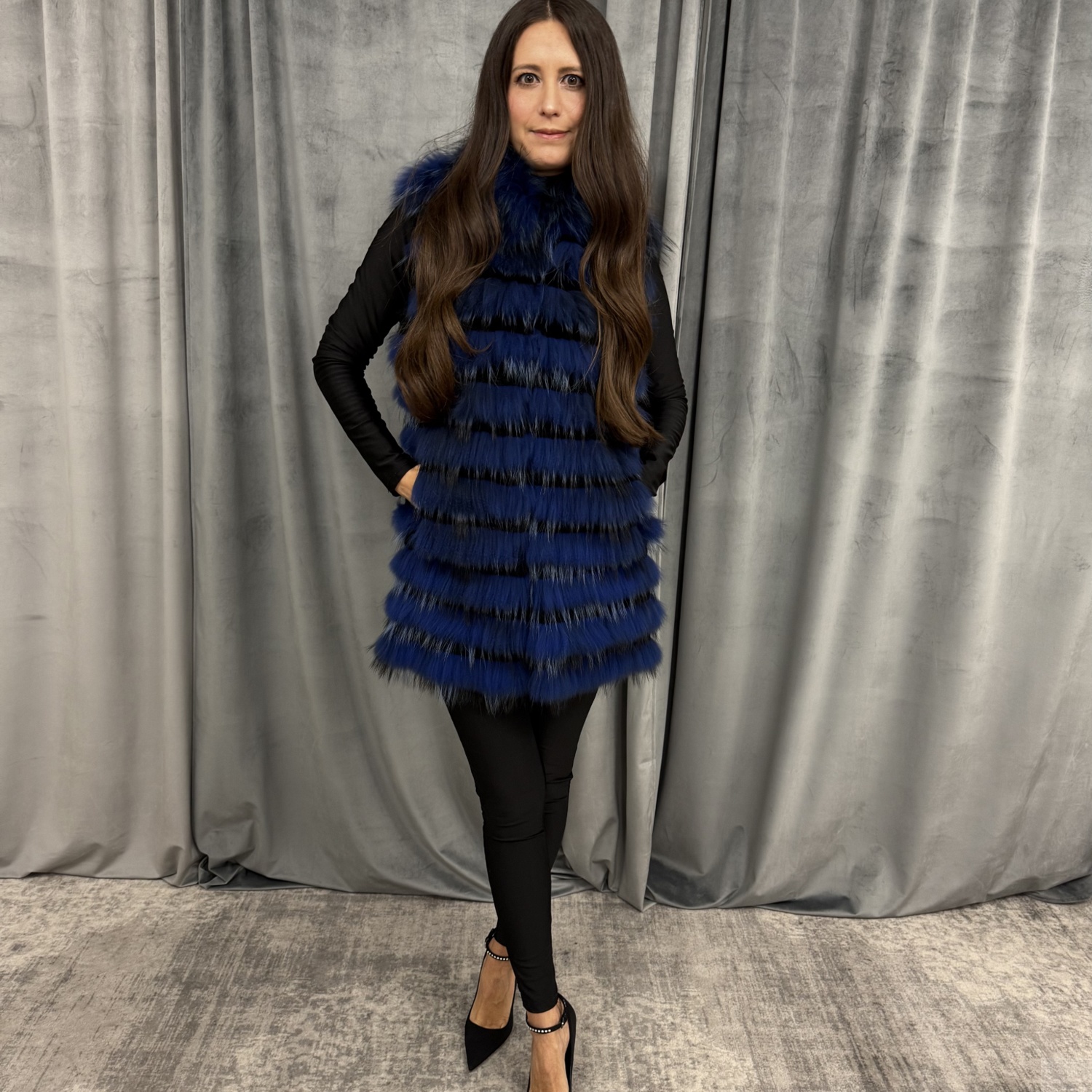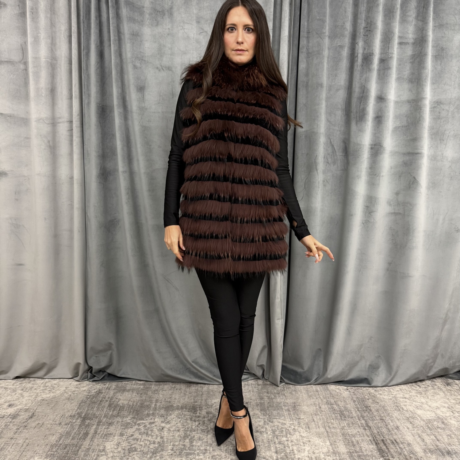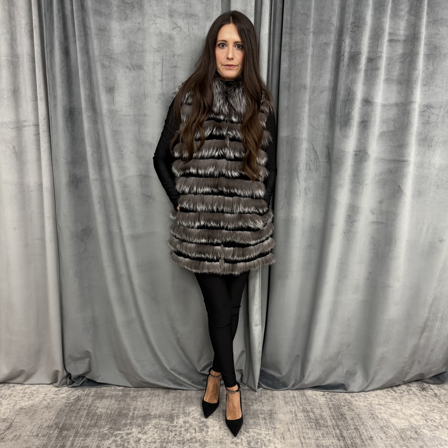 80 CM, GILET VOLPE CON INSERTI IN REX NERO